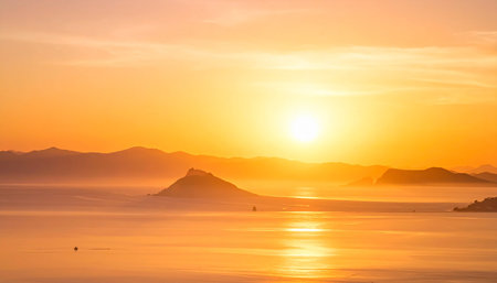 Gradient showing golden sunrise over a misty ocean with islands and mountains in the background. resolution...