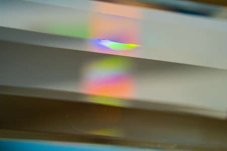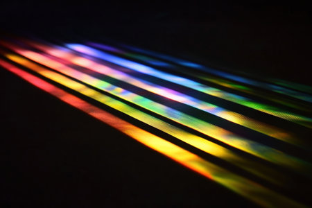 Light spectrum reflections creates colorful lines on dark surface, showcasing the beauty of refracted light in spectrum of rainbow colors.