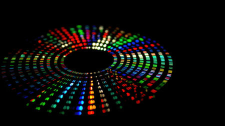 This captivating image showcases vibrant light patterns in a circular arrangement, creating a dynamic color spectrum against a dark backdrop. Perfect for artistic and technological themes.