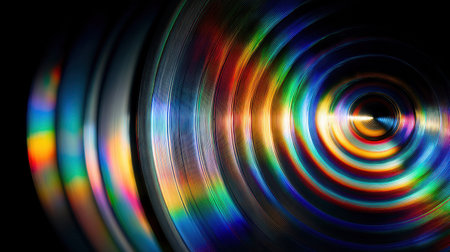 This mesmerizing image showcases colorful reflections on the surface of a vinyl record, creating a dynamic and artistic spiral pattern ideal for creative projects.