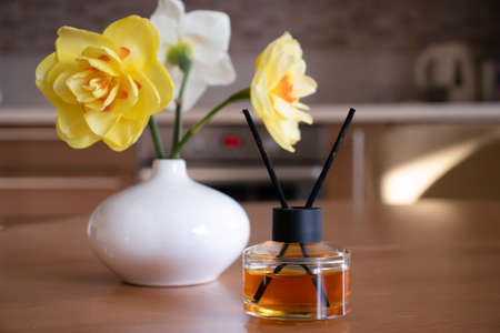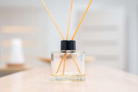 Aroma diffuser for perfumed liquid and reed sticks in the room on a wooden table.