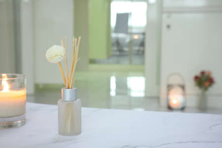 Reed diffuser on white table indoors. Cozy atmosphere