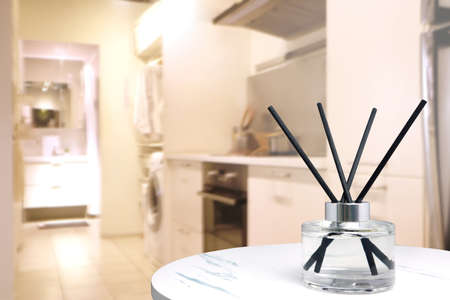 luxury aromatic scent of reed diffuser glass bottle is used as room freshener on the marble table in the bedroom to creat relax ambient with background of nice kitchen and laundry space