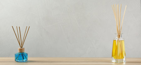 Reed air fresheners on wooden table against gray background, space for text