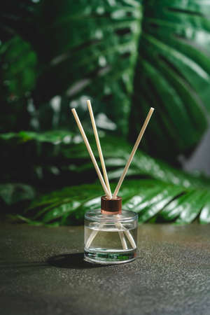 Aroma reed diffuser, home fragrance bottle with rattan sticks and smell of freshness on dark background with green palm leaves