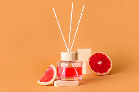 Reed diffuser with grapefruits on color background