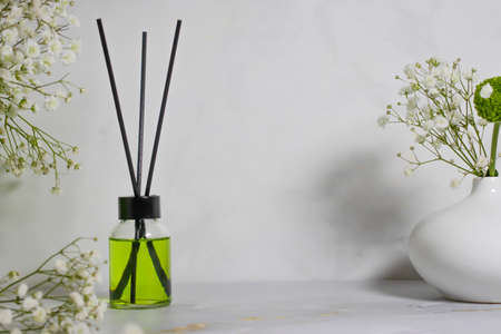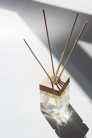 luxury aromatic scent of reed diffuser glass bottle is used as room freshener on the marble table in the bedroom to creat relax ambient with background of light from window and white bed in morning