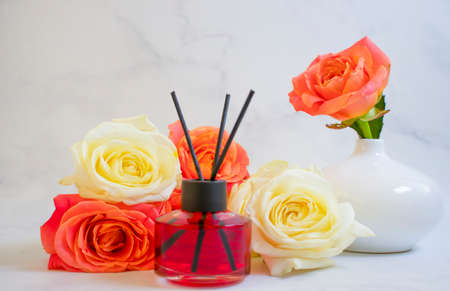 luxury aromatic scent of reed diffuser glass bottle is used as room freshener on the marble table with scented candle in the bedroom with background of the light from the window in the morning