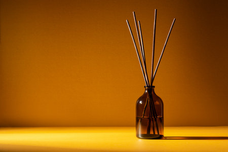 Amber glass diffuser bottle with fragrance sticks against a warm golden background. Minimal wellness and aromatherapy concept with soft lighting and shadows.