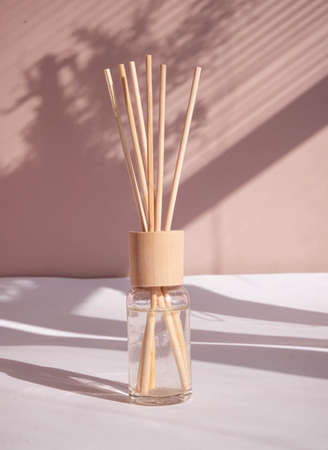 Aromatic reed freshener on pink pastel background boho style . High quality photo