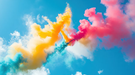 A vibrant explosion of colorful smoke fills the air against a bright blue sky, creating a dynamic and artistic atmosphere perfect for celebrations and festivals.