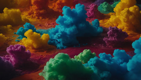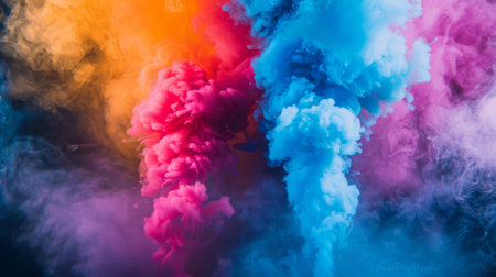 A dynamic visual of vibrant, colorful clouds of powder in motion against a dark background, creating a dramatic effect.