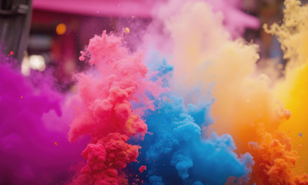 A vivid burst of colored powder fills the air, creating an explosion of pink, orange, and blue hues. The vibrant display evokes a festive atmosphere, suitable for celebrations or cultural events.