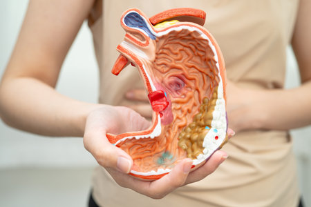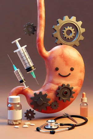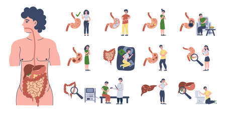 Visual demonstration of digestive tract, intestine, stomach, small colon, duodenum: illustrating issues like disease, pain, and nutrition, emphasizing the importance of gastrointestinal health
