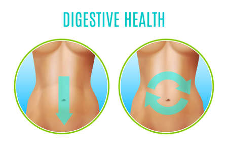 Digestive health realistic design including round icons with female belly and pointers on white background vector illustration
