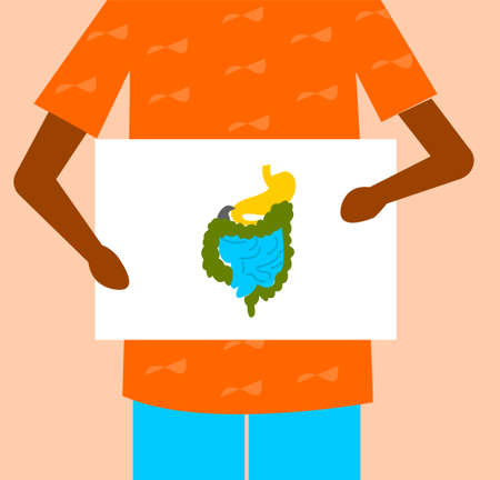 Man holding white board which illustrates intestine, symbolizes good intestine and gut i.e. Gastrointestinal tract