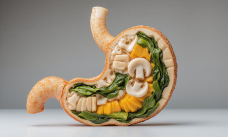 A hyperrealistic rendering of a human stomach, in a cut-away view to show its intricate internal layers, crafted entirely from