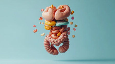 This vibrant 3D illustration features a detailed model of the human digestive system, creatively displaying various organs and abstract elements. Perfect for educational use.