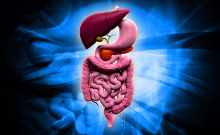 Digital illustration of human digestive system in coloured background