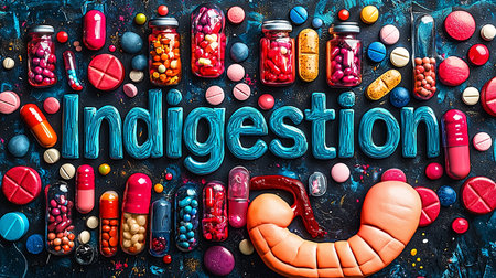 Artistic illustration of the word 'Indigestion' surrounded by an array of colorful medications and a stylized stomach, highlighting digestive health themes and medical concepts.