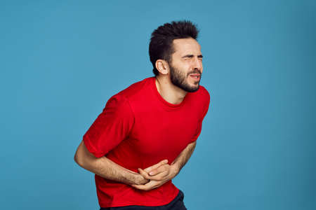 man in red t-shirt health problems emotions symptoms blue background