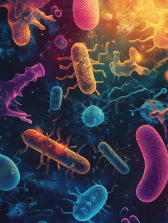 A vivid digital illustration showcasing bacteria and microbes in a captivating light display, representing the microscopic world with creative flair and scientific precision.