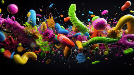 An engaging digital illustration showcasing an explosion of colorful bacteria and microorganisms, radiating creativity and energy in a modern abstract design.