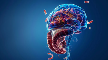 This medical illustration showcases a detailed view of the human intestines. It highlights the digestive system with vibrant colors and intricate textures. The composition employs a clear and informative style, possibly for educational or scientific purposes. This image may be suitable for use in medical publications or educational resources.