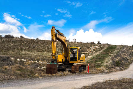 Yellow excavator on a road construction site against blue sky.