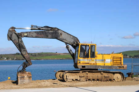 Yellow excavator stands on a steep seashore. Side view