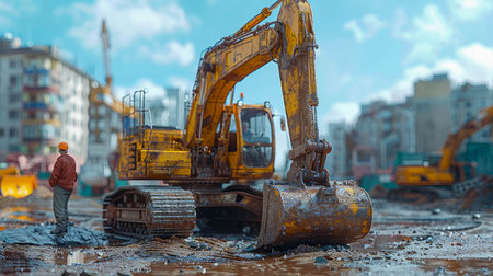 Construction site excavator digger miner excavation building mud heavy powerful hydraulic machinery industrial equipment working engineer professional digging mining carry bulldozer dirt workplace