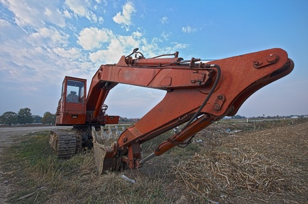 Old excavator standing on the grass beside the road