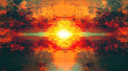 Abstract digital sunrise over modern pixelated cityscape creating data flow