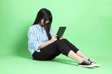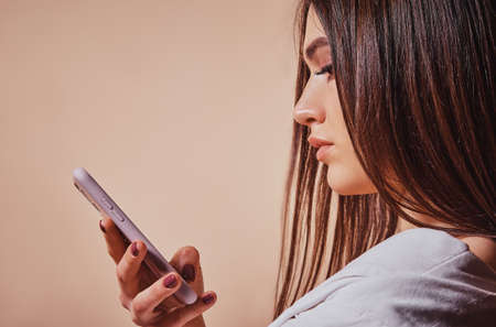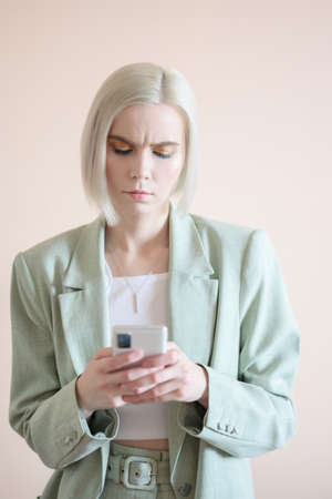 Portrait of young cool woman holding smartphone. Sending text messages. Isolated on background
