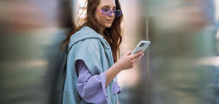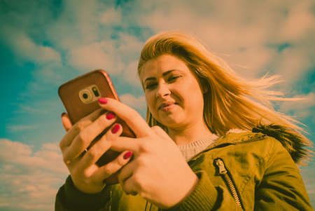 Social media, technology, modern devices, internet concept. Woman teenager wearing warm coat using her smartphone while walking outside on sunny day, sky with clouds in background