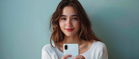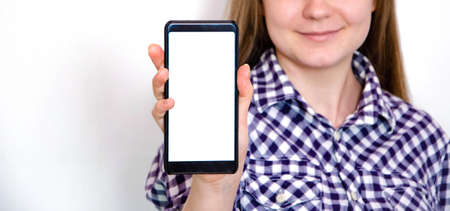 A young girl in a plaid shirt with long hair stands on a white background and holds a smartphone in his hand. Shows smartphone screen, white screen. A girl shows something on a smartphone.