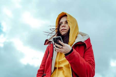 Portrait of young woman with mobile phone on background of sky. Brunette in yellow hoodie and red jacket browsing smartphone in cloudy weather