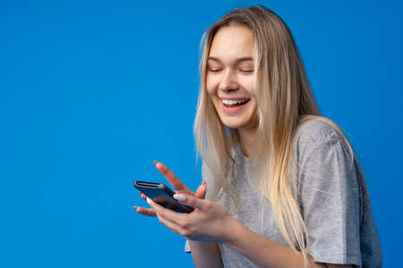 Woman doing Video Call using a phone isolated on blue background. Portrait of surprised upset sad thoughtful minded female looking phone trying to understand information.