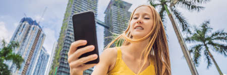 Woman Tourist using navigation app on the mobile phone. Navigation map on a smartphone in a big city BANNER, LONG FORMAT