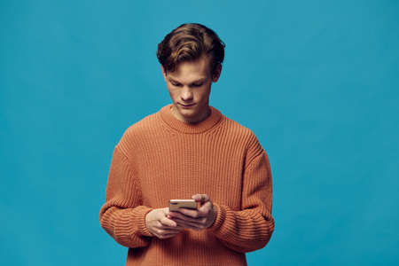 A man uses a smartphone to access social digital media in the Internet: shopping, entertainment, search and file storage. The concept of a global network expansion