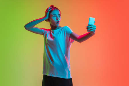 Shocked with smartphone, selfie. Young caucasian girls portrait on gradient green-orange studio background in neon light. Concept of youth, human emotions, facial expression, sales, ad.