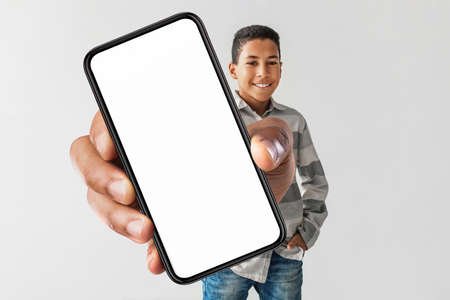 Happy African American Boy Holding Huge Smartphone On Gray Background