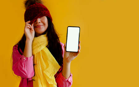Funny asian Girl Showing Smartphone Green Screen Advertising Application, Yellow Autumn Background.