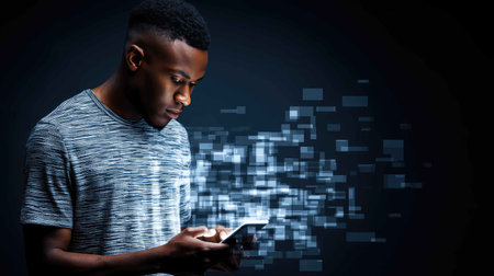 A thoughtful young man engages with his smartphone, surrounded by digital elements. The dark background emphasizes his focus and the futuristic theme of technology.