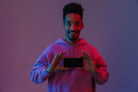 Portrait of pleased african american man in colorful hoodie smiling and holding cellphone isolated over violet background