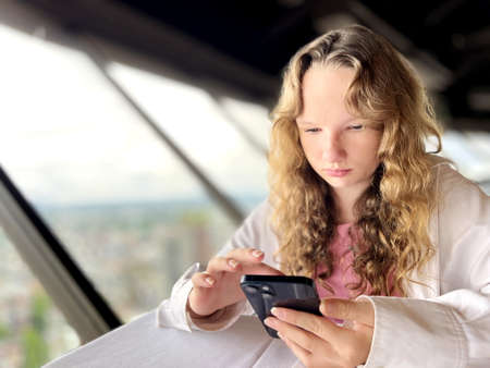 a teenage girl in a white shirt with blond hair sits and looks at the phone she is interested And with her finger something corrects the black phone Top Of Vancouver Revolving Restaurant