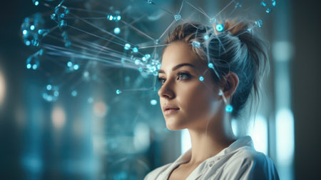 A young woman in profile showcases a captivating vision of technology and creativity, as symbols and data flow from her mind, representing innovation.