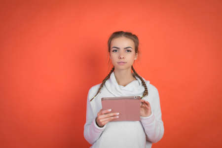 Young teenage woman using tablet surfing on internet, working or getting inspirations.