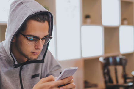 Portrait of young man sitting on the sofa and using smartphone.