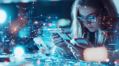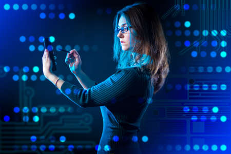 Young girl using virtual screen; checking database and identity on high tech technology